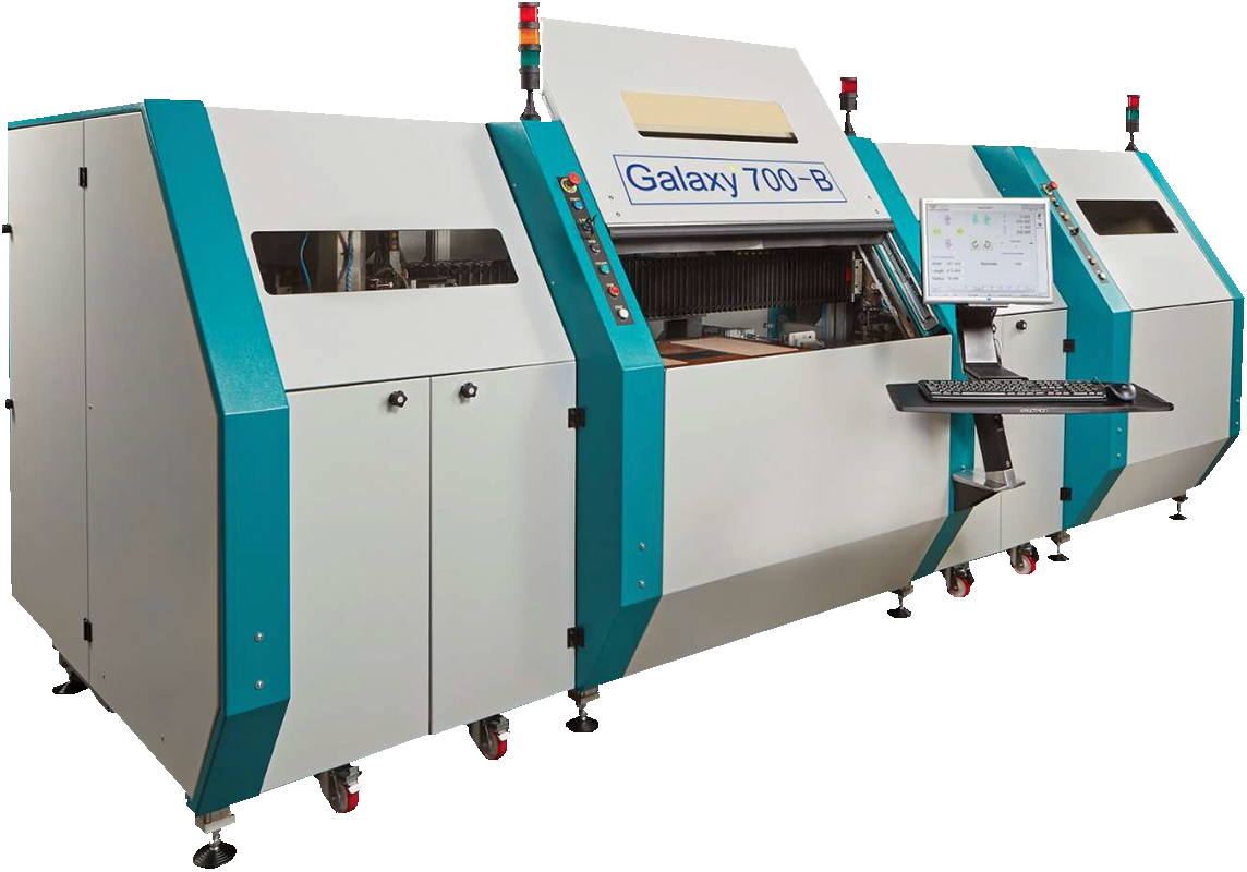 La macchina Galaxy 700-B è un sistema di lavorazione completamente automatizzato dotato di un modulo di smussatura che rifila i pannelli per rimuovere le lamine di rame in eccesso lungo i bordi e le ondulazioni generate dalla pressa. Questa fase consente di ottenere un pannello dritto e preciso con bordi smussati, consentendo una manipolazione sicura del pannello ed evitando infiltrazioni dovute alle successive preparazioni chimiche.